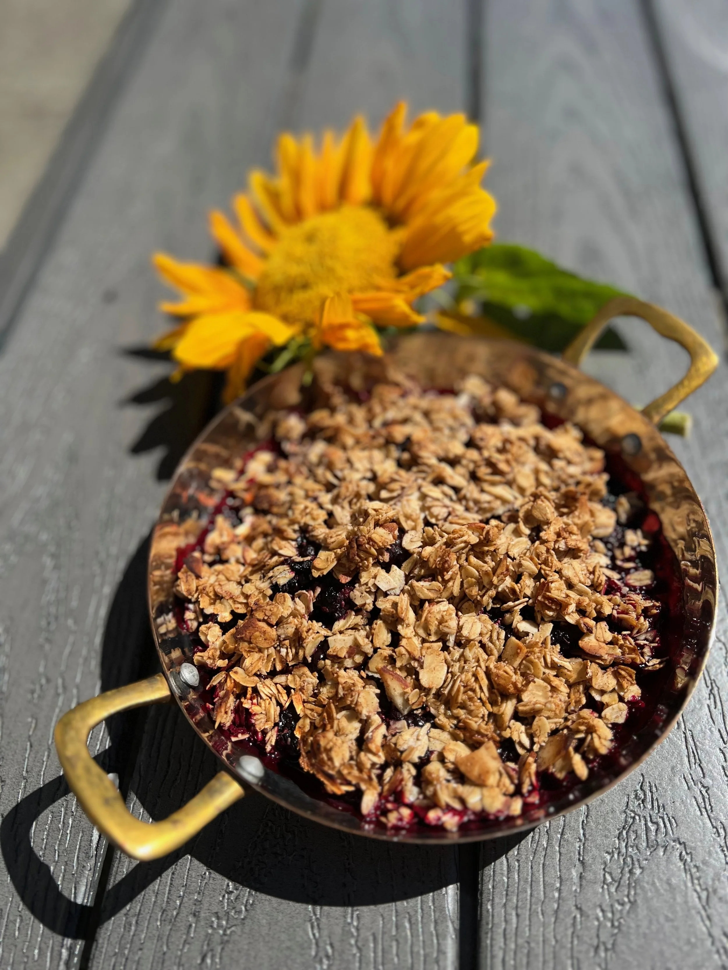 We are fruitaholics. Especially when it comes to berries. Blueberry, strawberry, raspberry, blackberry: we’ve never met a berry we don’t love. They are best fresh off the bush. But it’s a short season. So we pick extra and freeze them and, of course, buy frozen berries throughout the rest of the year. And this recipe is our favourite way to eat those frozen berries. Our family has been known to polish the whole pan. It’s delicious, healthy (all those antioxidants in the berries!) and fast and easy to whip together.